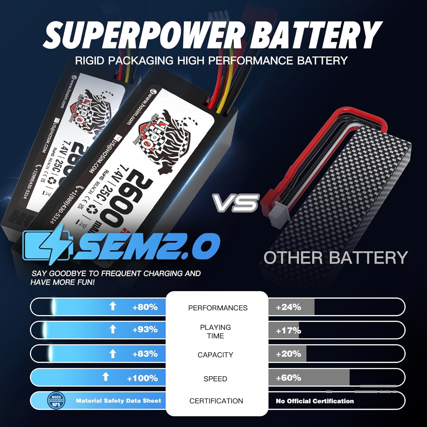 2 Packs 2600 mAh Batteries: Includes two 7.4V 2600 mAh batteries and a dual battery connector so both can be used together for extended runtime. The vehicle can run for up to 40 minutes per charge cycle.
