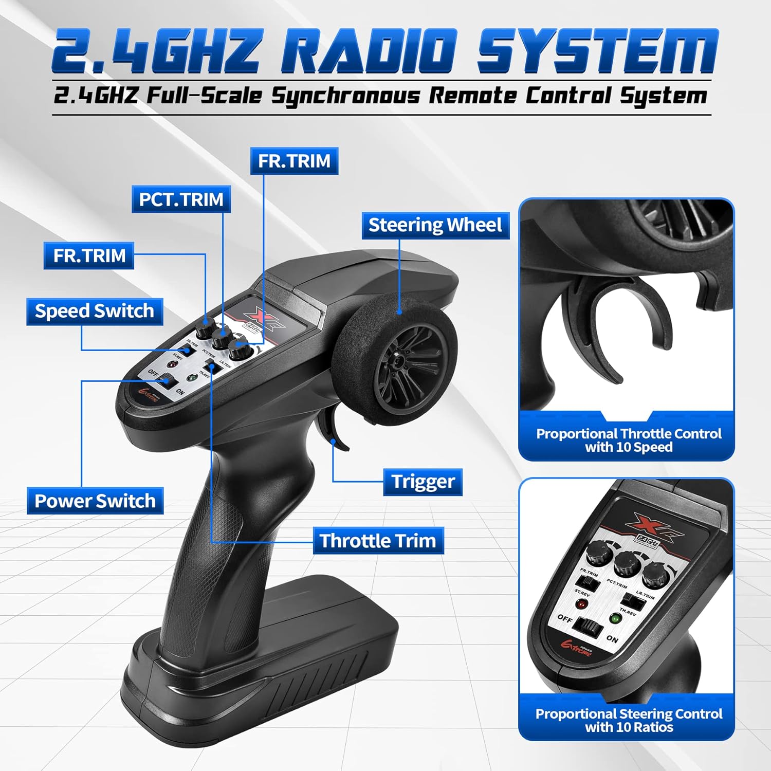 2 Car Shells & 2-Speed Mode: Comes with an extra blue body shell for customization and racing variety. The 2.4 GHz remote control offers up to 80 m range with responsive steering and throttle. It includes full-speed (68 km/h) and half-speed (34 km/h) modes for beginners and advanced users.