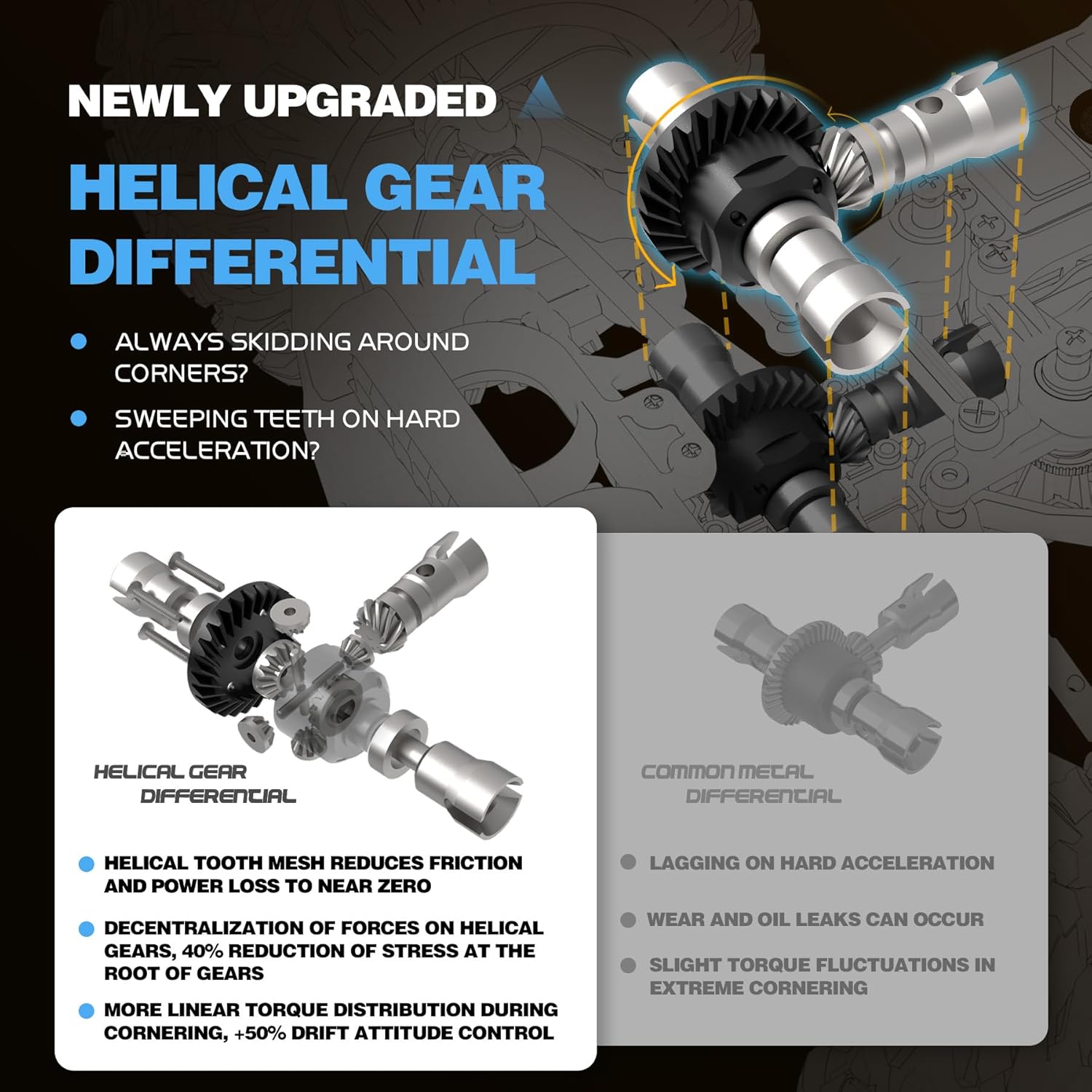 Upgraded Oil-Filled Shocks & Differential Gear: Features four aluminum oil-filled shocks and heavy-duty wheels for performance on sand, desert, rocks, puddles, and grass. The upgraded metal differential gear improves durability and handling.
