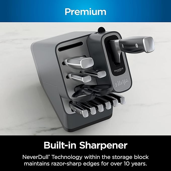 • BUILT IN SHARPENER: NeverDull Technology is conveniently built into the storage block for professional sharpening results that will maintain a razor sharp edge for over 10 years